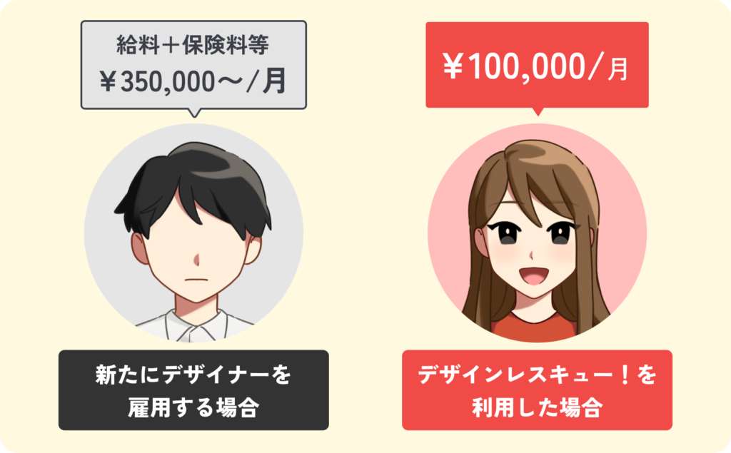 デザインレスキュー!では基本料金10万円/20時間から利用可能!お得なサービスもあるので外注したりデザイナーを雇用するよりも費用を抑えられます。
